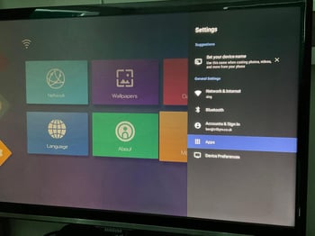 Using the device's remote control, navigate to the Settings menu and scroll down to Apps.