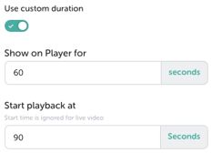 You can adjust the duration for Show on player for and Start playback at to select precise moments from the YouTube video to showcase.