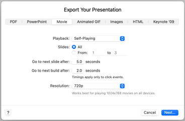 The image shows the Default settings for Keynote Movie export on macOS - these are great!