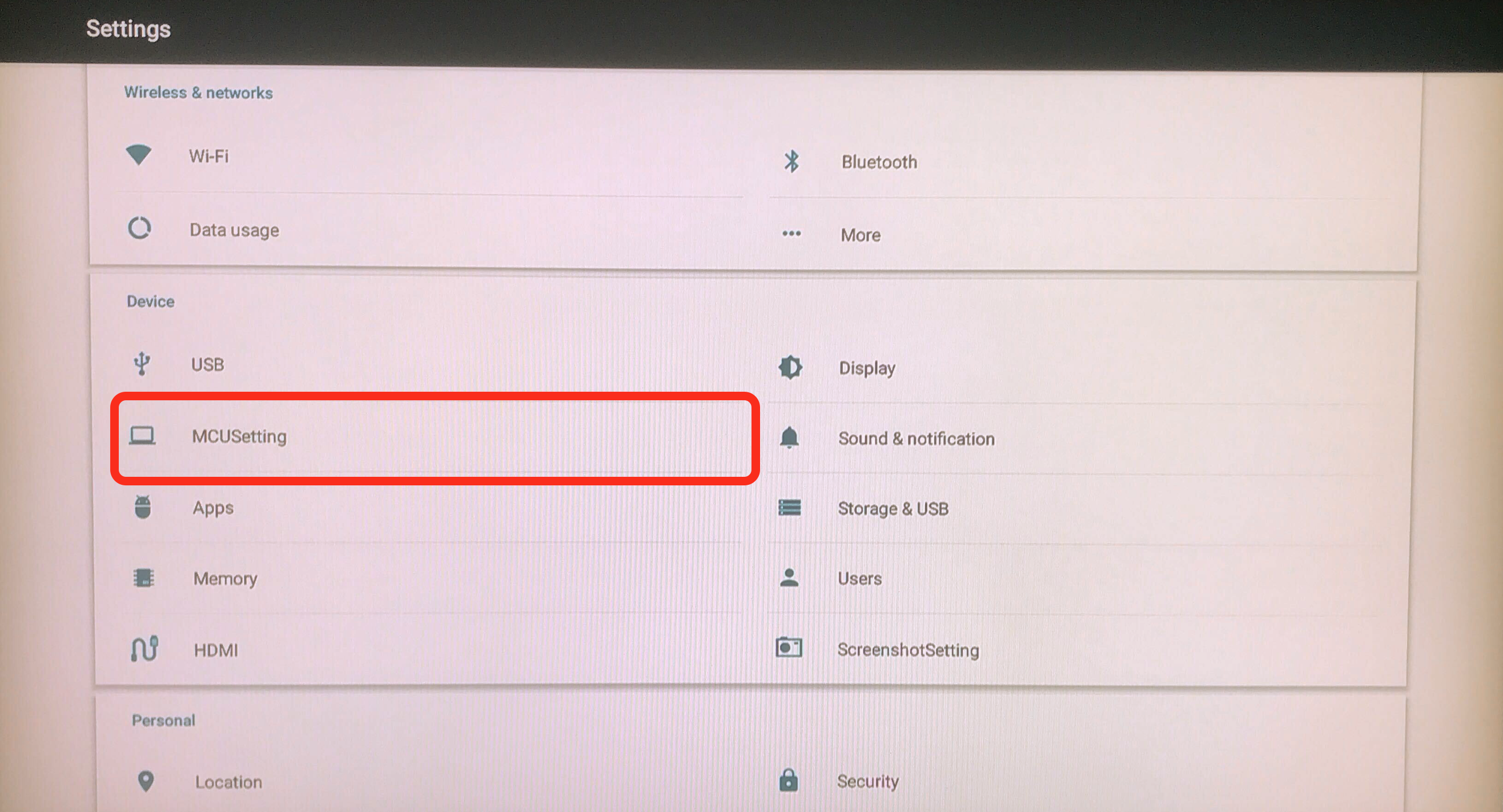 Use the Remote control or a connected keyboard and mouse to open the Settings app on your Minix device.