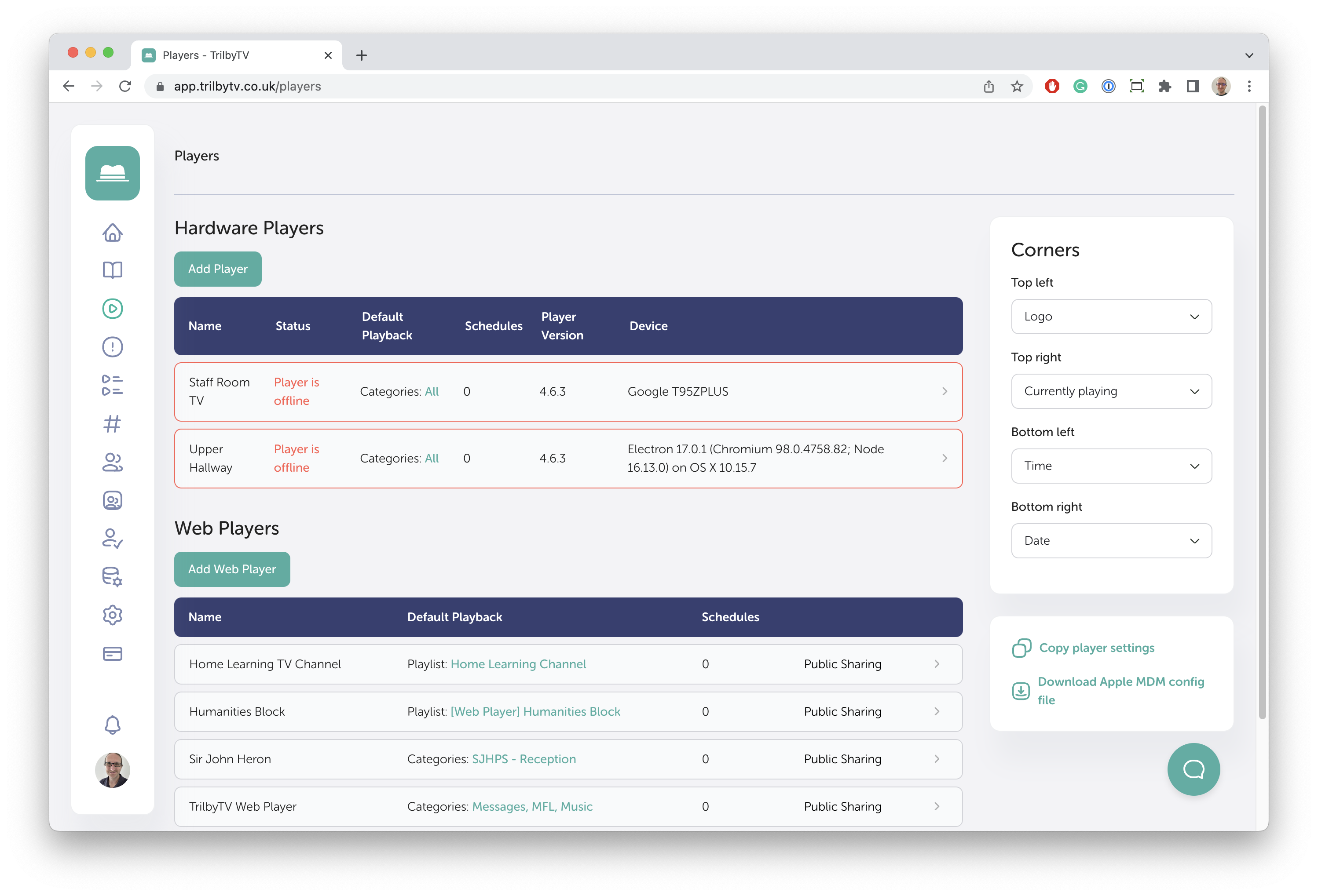 Players can be accessed within the TrilbyTV web app so long as you have the correct permissions. It gives you an at-a-glance view of which players are working and control of what they are playing.