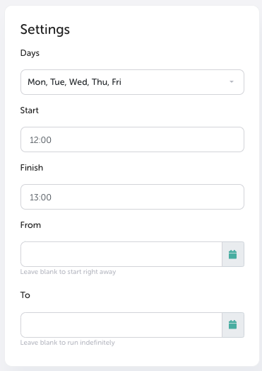 4. Choose the days on which you'd like the content to be shown and add a Start and finish time. You have the option to repeat the schedule on certain days of the week or only to run this schedule between certain dates.