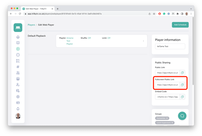 Web Players work just like your other player devices in that they can be set to show one or more categories, a Playlist or a Single item. See What are web players? for more information. - With your Web Player configured the way you want, copy the Fullscreen Public Link over on the right-hand side.