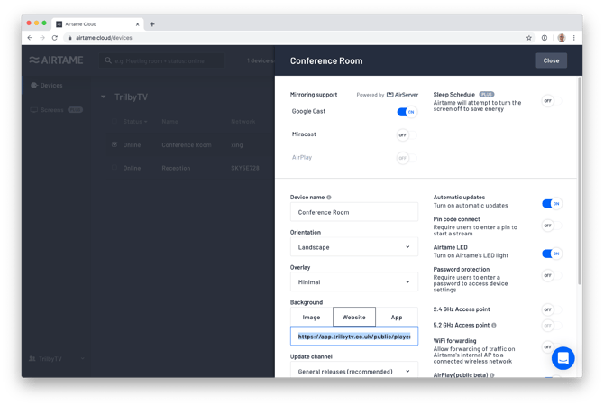 - Click Apply Changes and in a few seconds your Airtame will update and start playing back TrilbyTV content in the background.